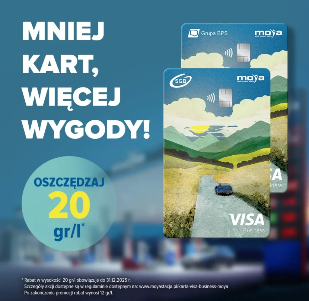 MOYA, ogólnopolska sieć ponad 500 stacji paliw należąca do Anwim S.A., we współpracy z Visa oraz Bankami Spółdzielczymi Zrzeszeń BPS i SGB, wprowadza na rynek nowe rozwiązanie dla biznesu – kartę Visa Business MOYA. To narzędzie płatnicze, które łączy funkcje klasycznej karty płatniczej z funkcjonalnością karty flotowej. Odpowiada tym samym na potrzeby przedsiębiorców, którzy poszukują wygody, bezpieczeństwa i dodatkowych benefitów.