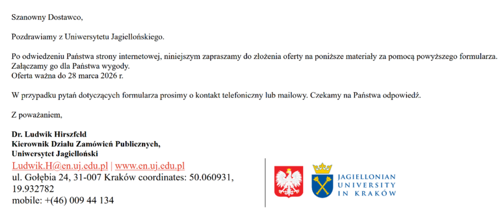 Tego typu wiadomości wysyłane bywają często dużym grupom odbiorców, aby zmaksymalizować szanse przestępców na osiągnięcie zysku i pobranie przez ofiary złośliwego oprogramowania. W tym przypadku mamy do czynienia z podszyciem się pod jeden z najstarszych uniwersytetów na świecie, a głównym celem kampanii cyberprzestępców były firmy, które mogą być zainteresowane współpracą z UJ.